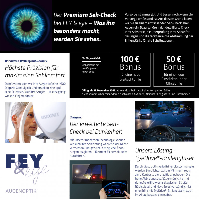 Gültig vom 1. November bis 31. Dezember 2025. Anwendbar beim Kauf einer kompletten Brille. Nicht kombinierbar mit anderen Nachlässen, Aktionen, Aktionsbrillengläsern und Gutscheinen.